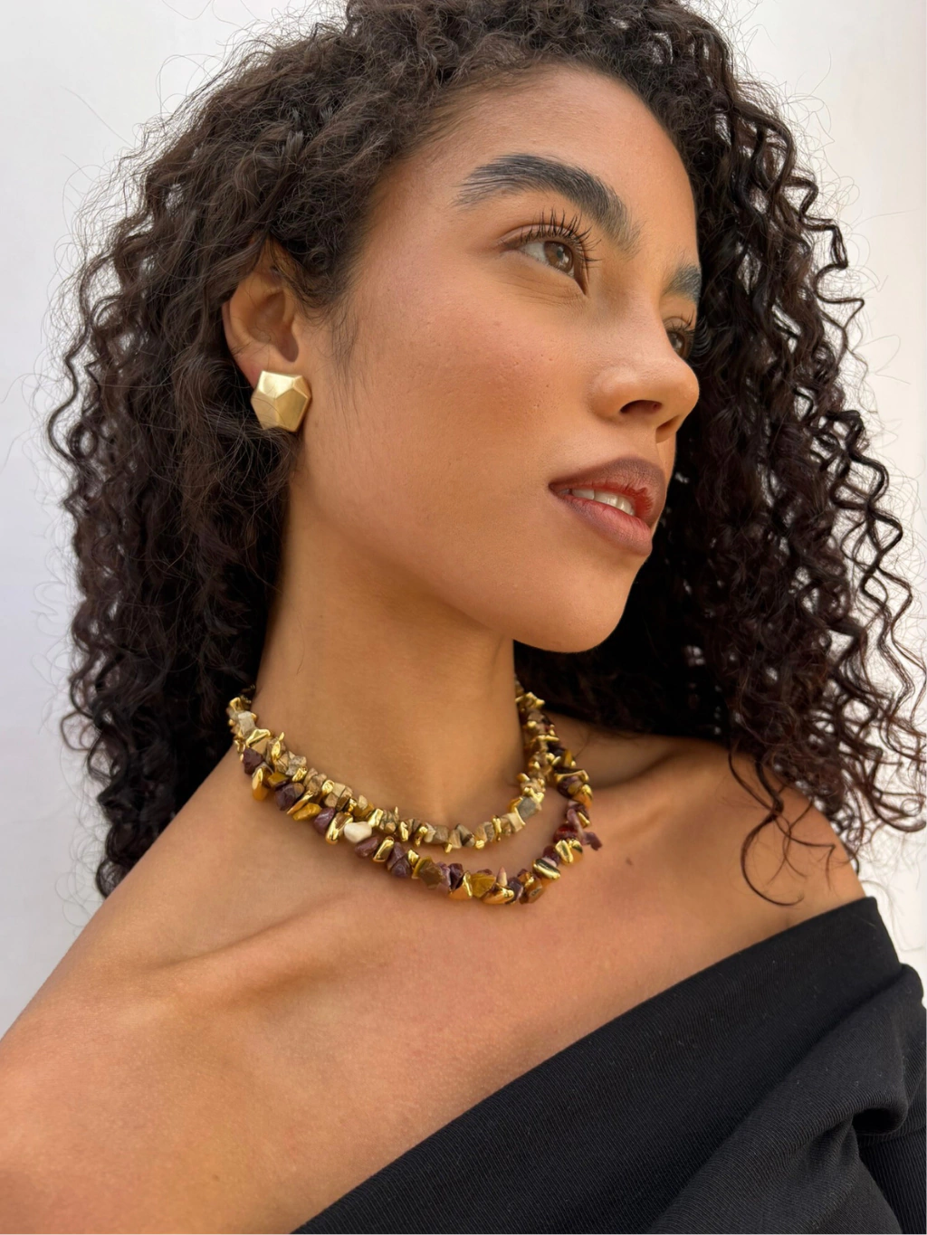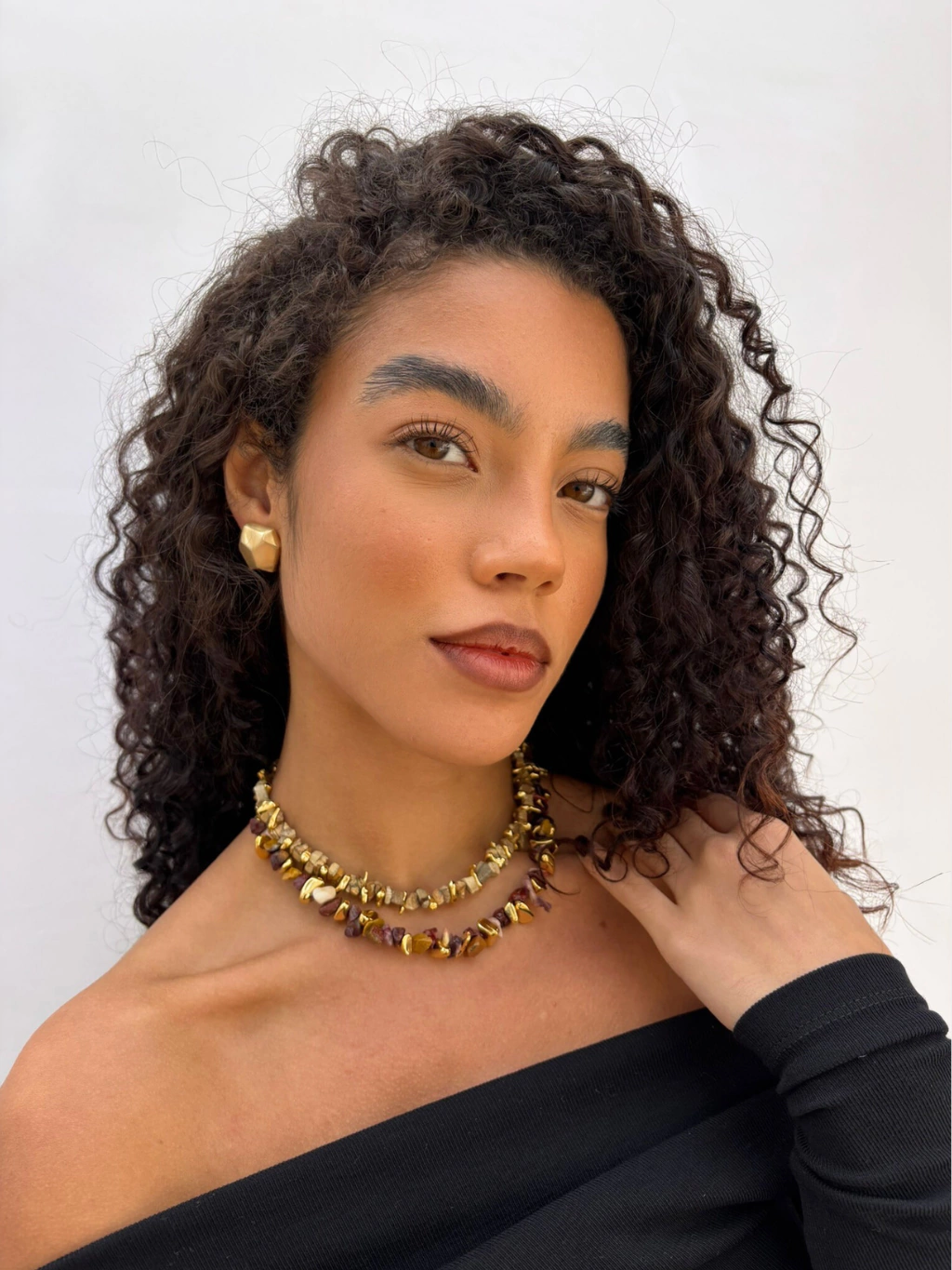 Se você ama peças super estilosas e diferentonas, nosso Colar pedra Sabão é a peça perfeita pra você! Ele fica lindo usado sozinho - assim toda a atenção vai ser direcionada pra ele, trazendo estilo e sofisticação pro seu look - e também combinado com outros colares dourados e/ou com nosso Colar Jade, numa produção super maximalista e estilosa!