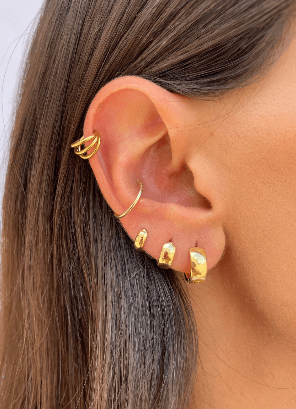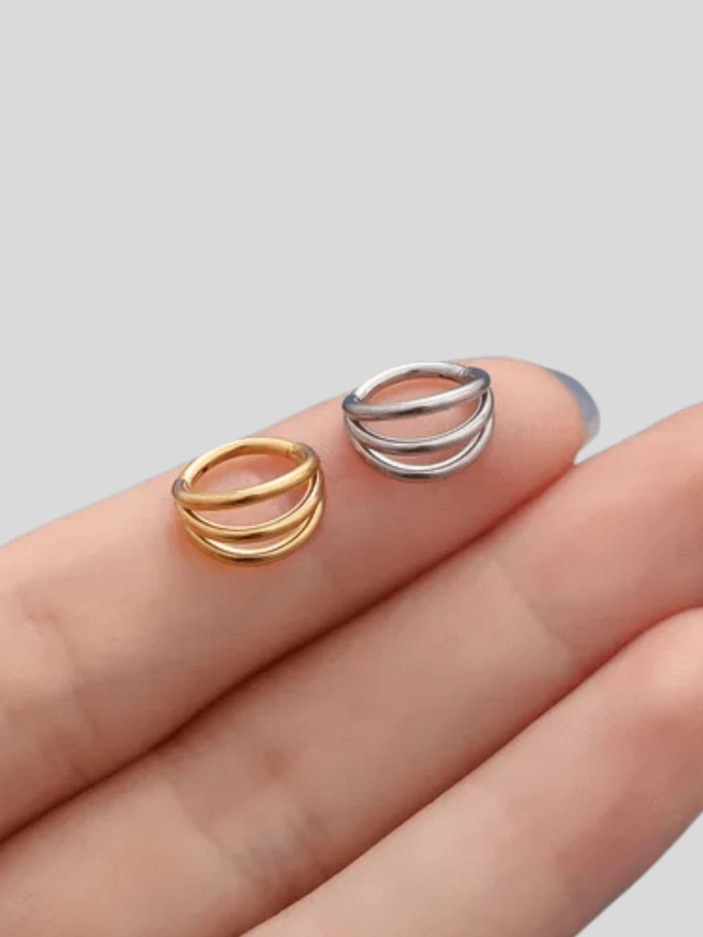 Nosso Piercing Argola Tripla é a própria definição de estilo. Seu design de três aros sobrepostos cria um visual moderno e super cool, perfeito para quem busca autenticidade. Por ser uma peça mais robusta, indicamos que seja usado no hélix. Com relação às combinações, pode ser usado com outras peças douradas, para um look mais coeso e tradicional, ou misturado com peças prateadas, numa proposta moderna e ousada.