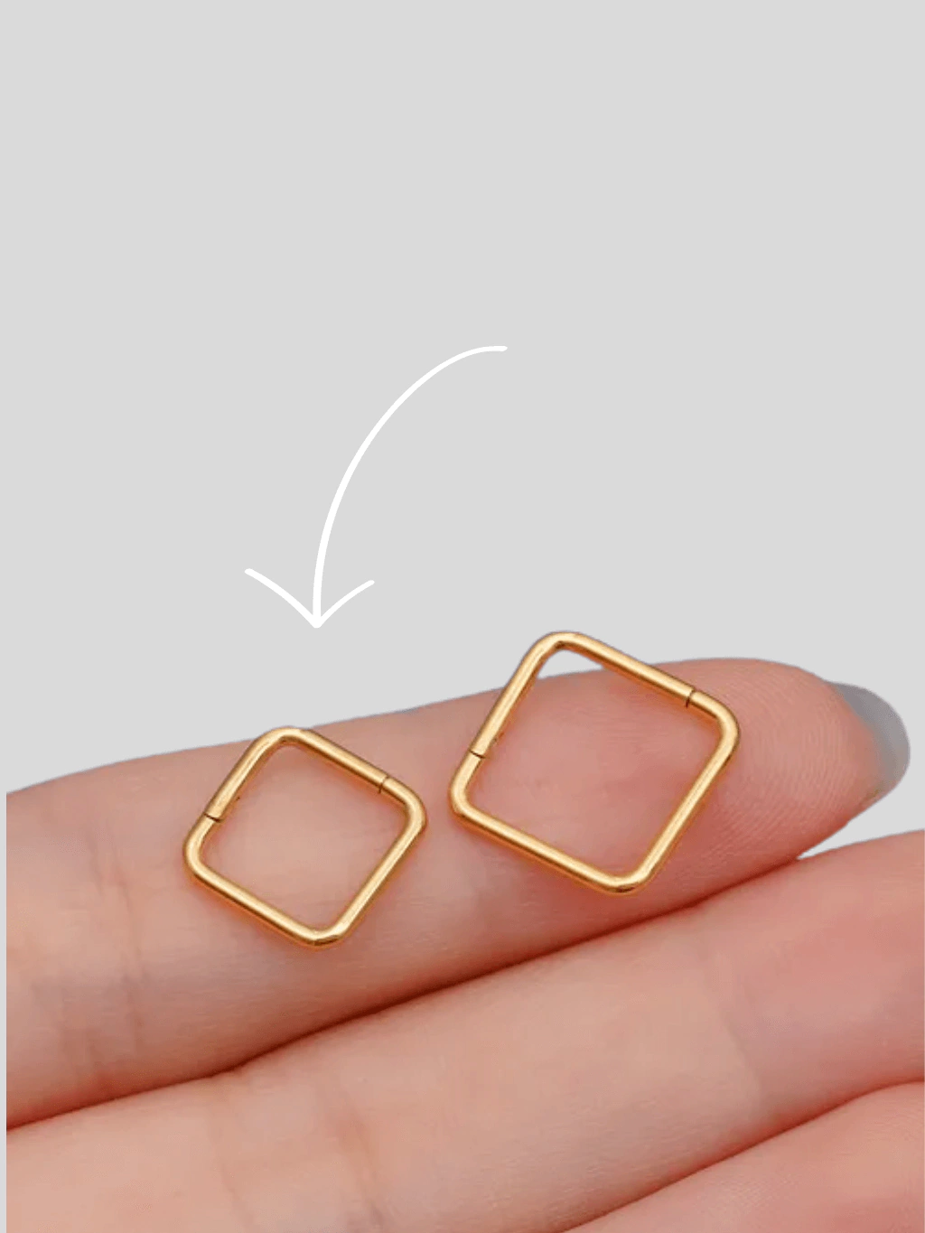O Piercing Quadrado é a escolha perfeita para quem busca um toque moderno e cool nas suas composições. Seu design angular oferece um contraste interessante com outras peças de formatos tradicionais, permitindo combinações criativas e ousadas. Pode ser usado no hélix, lóbulo, daith, tragus, anti-hélix, anti-tragus ou rook.
